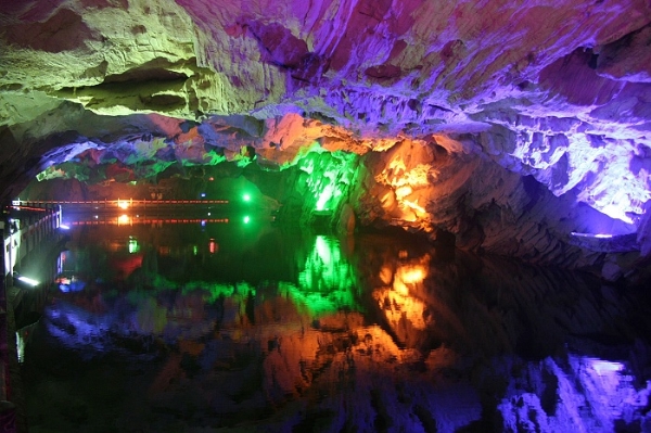 坐在船中,看河水清澈晶莹,溪中怪石嶙峋,气象万千,或如蛟、或如鳖、或如龟、或如鸟、或如象,在五彩的灯光下,色彩斑斓,形态华肖;更有龙舞蛟腾、紫电飞空、金霞生辉的特殊水中世界,撩人遐思神往。